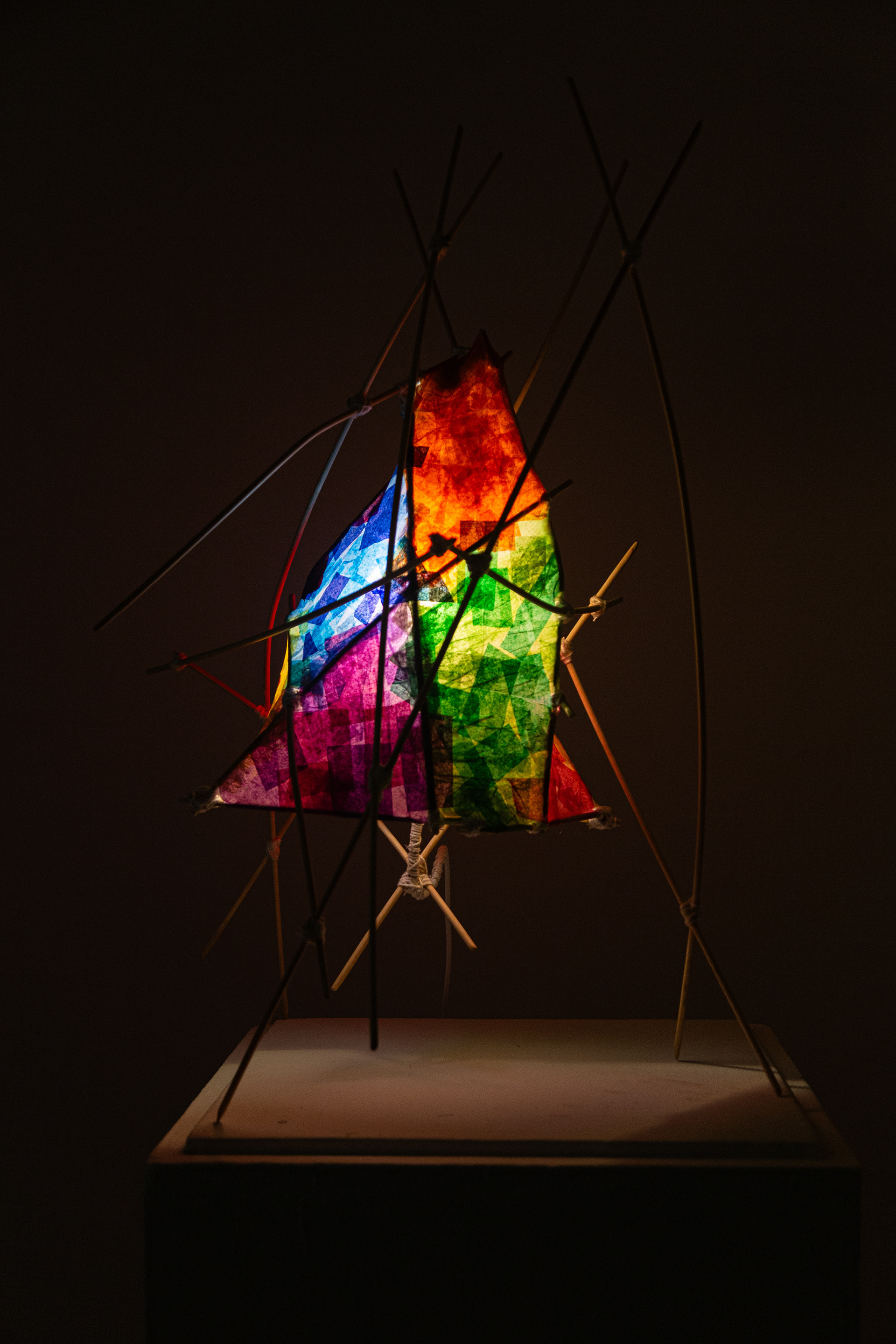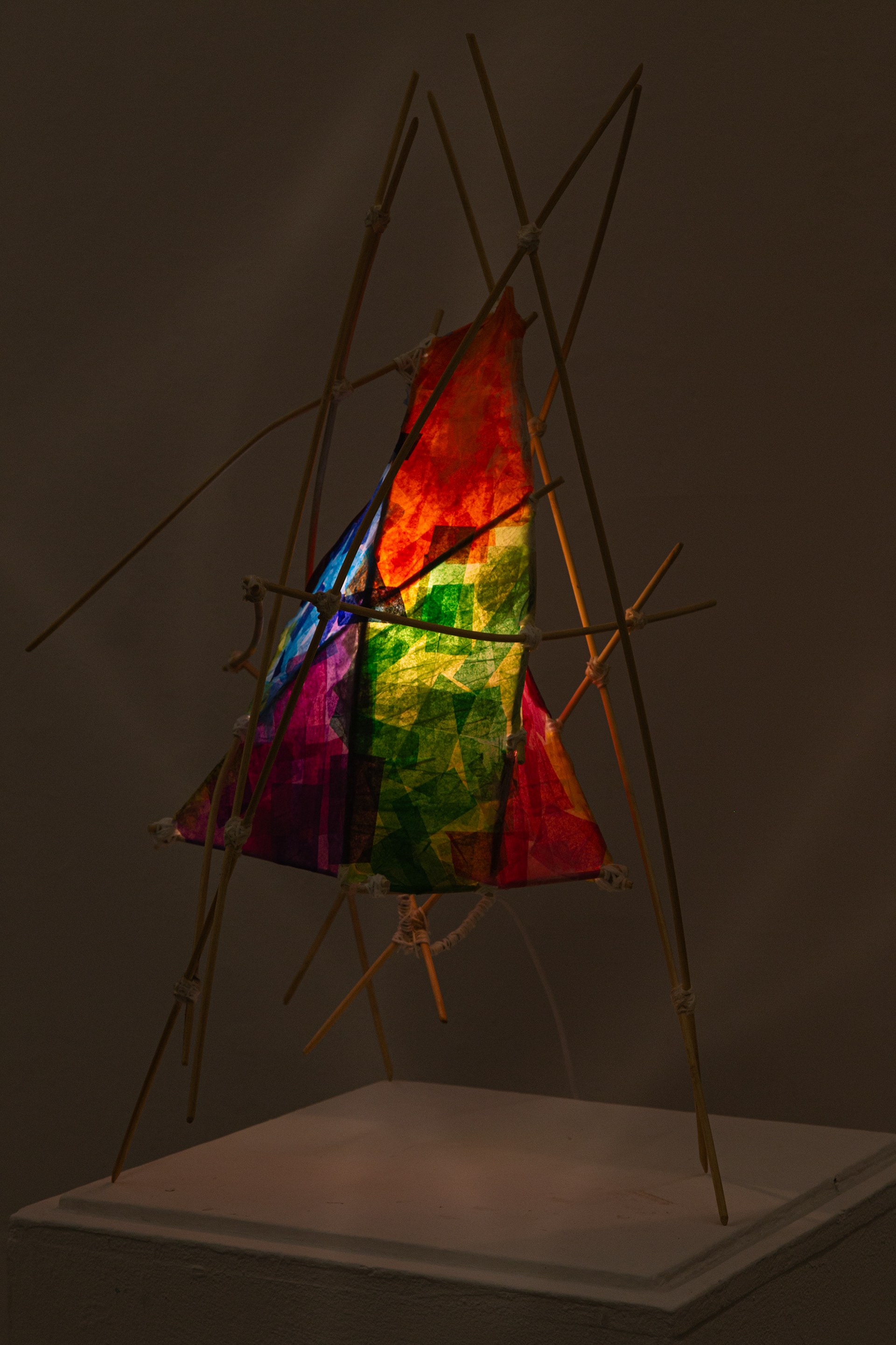 Tissue paper, wooden dowels, yarn